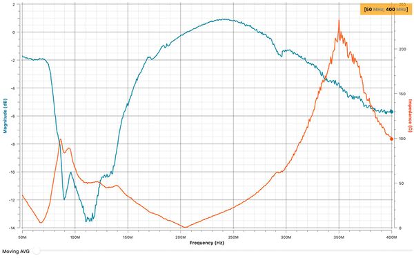 Frequency plot of Bob Archer antenna (shows 50 Ohm and resonance in the VOR/LOC frequency range of 108-118 MHz):