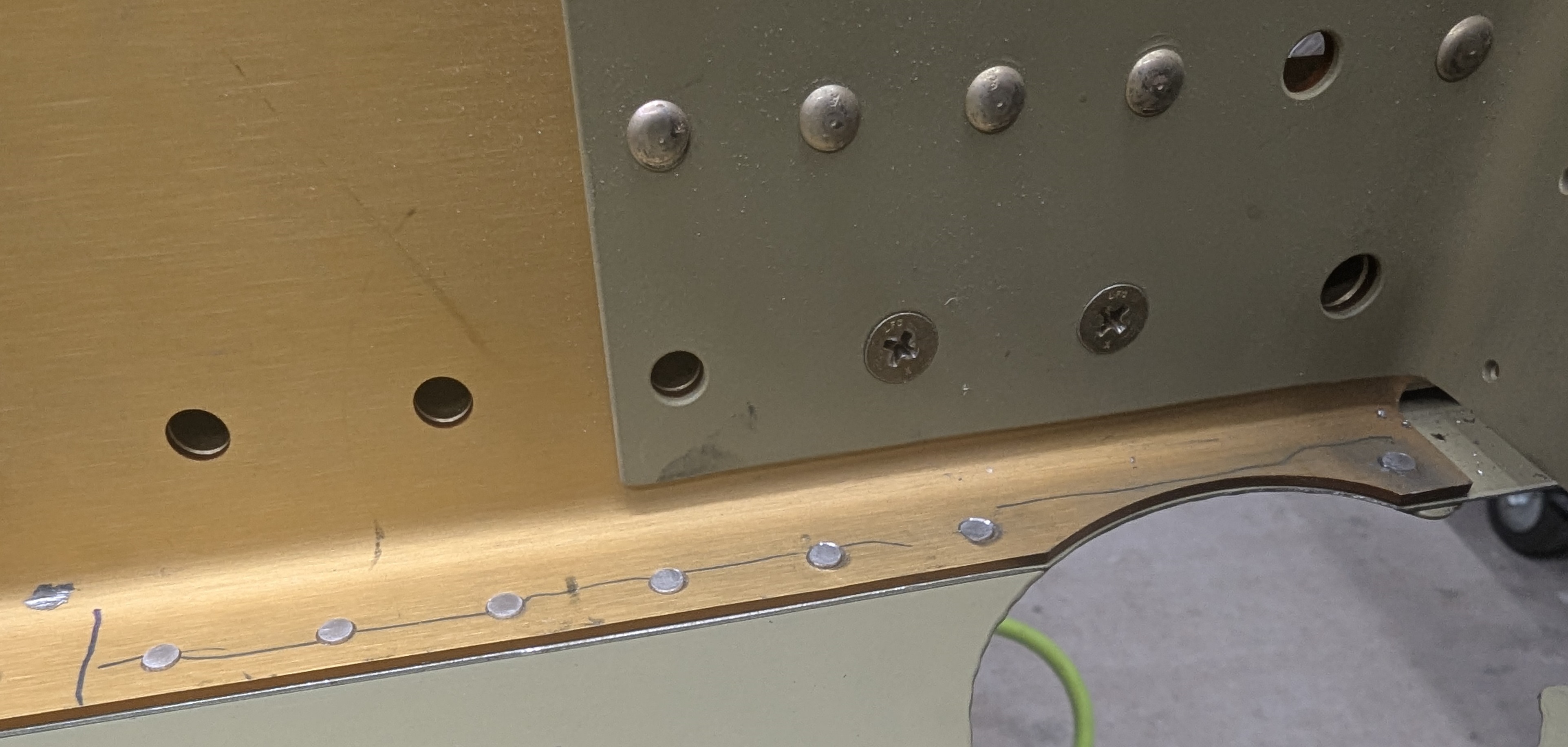 Double-flush rivets, shop head, outboard side of bottom flange of forward bulkhead.