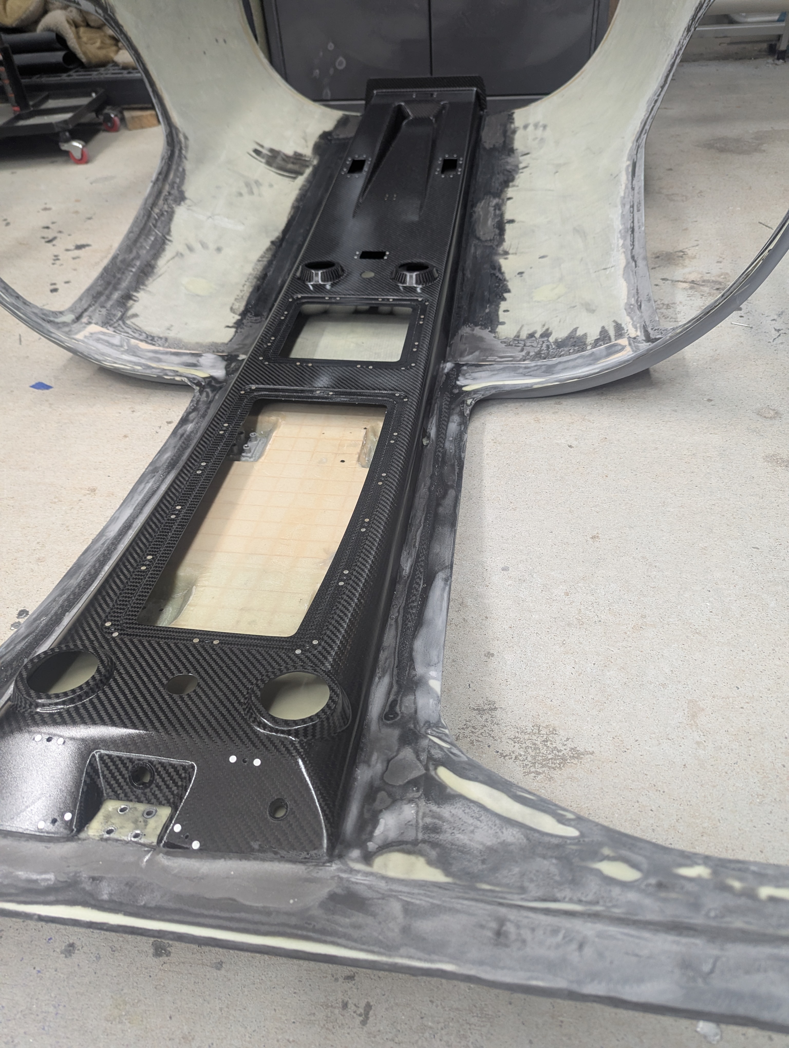 Aerosport overhead console attached to cabin top with epoxy under and over the flanges.