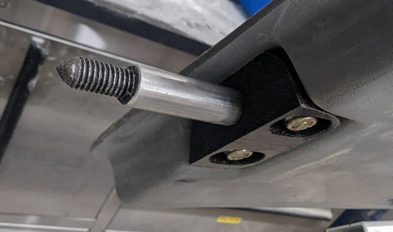 Van's method to mark where to drill door pin holes into cabin top, but since the builder is using aftermarket PlaneAround machined pins, an temporary double-threaded spacer was used.