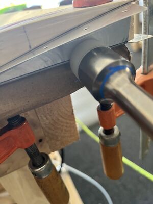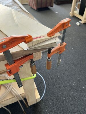 When doing the other end, draw a line w/ sharpie from the angle edges. Put the wood block in at the same angle as the line. Clamp to the table same as other end. Clamp it FIRM.